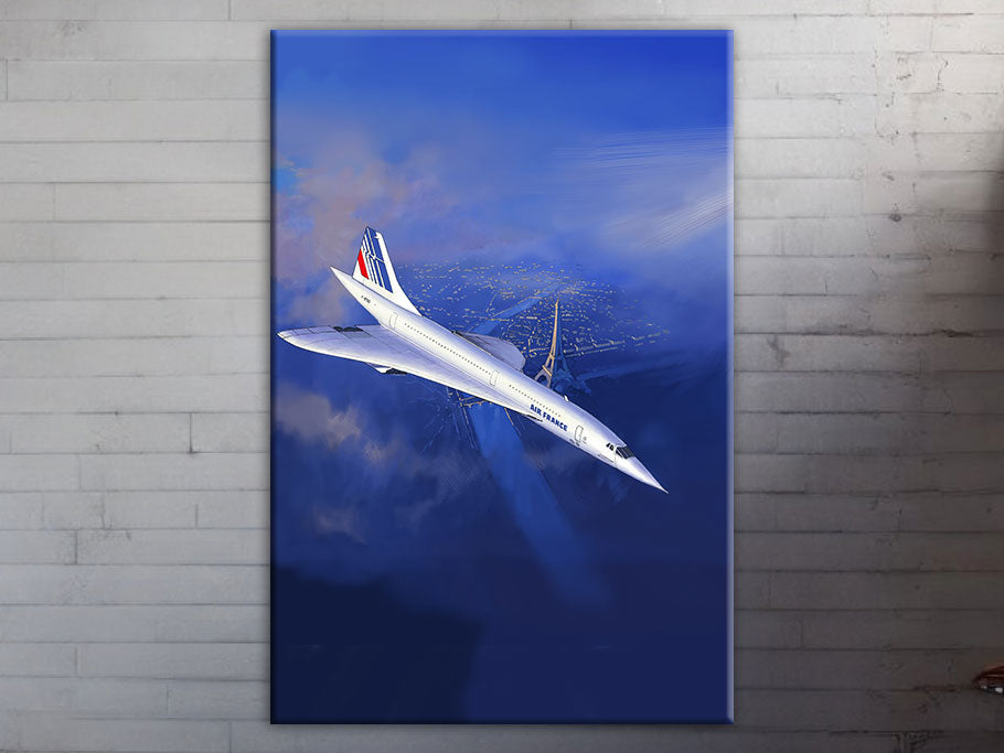 Reproduction en impression à la demande d'une œuvre représentant un Concorde au-dessus de Paris.