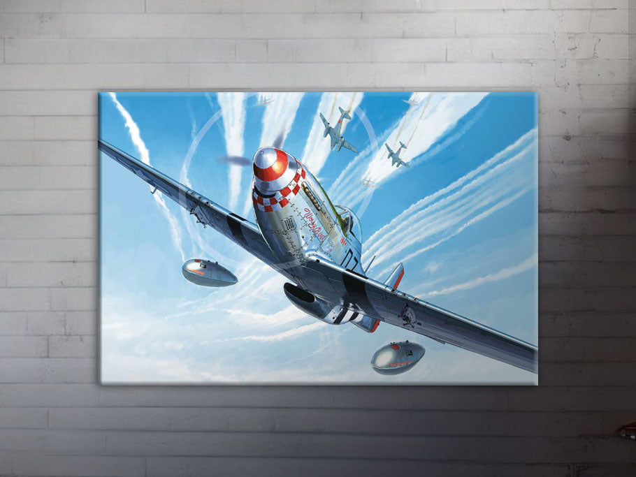 Surpris par deux Me 262, ce P-51D largue ses deux bidons pour s’alléger et gagner en maniabilité.